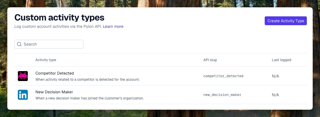 On the Custom Activity Types page in settings, create types of activity:- Sync in custom signals from your own product