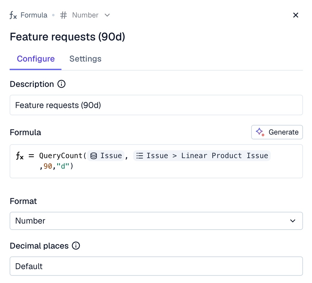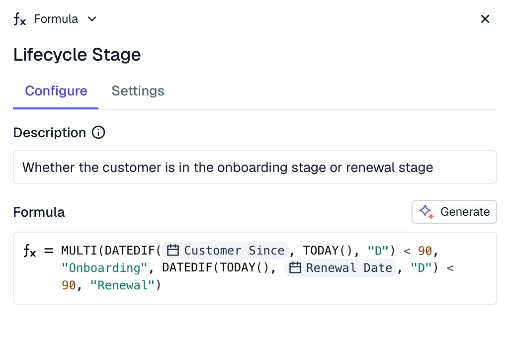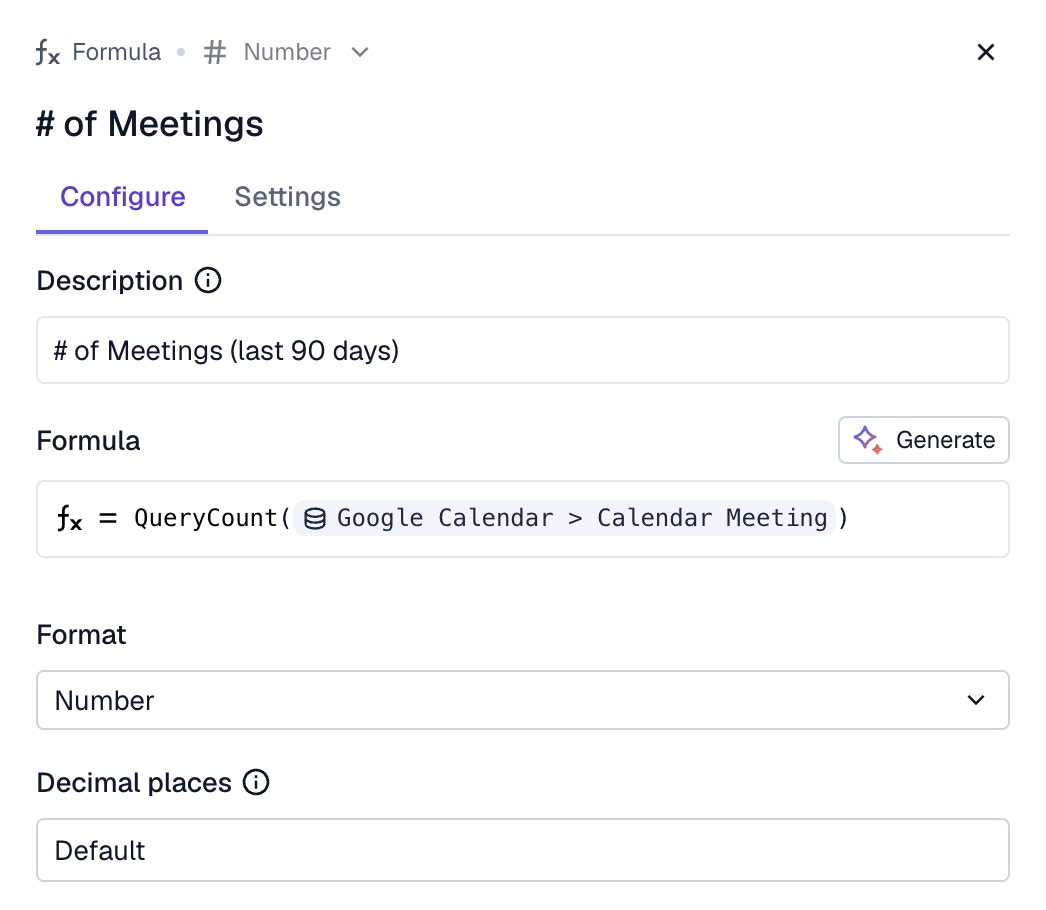 For example, a formula to calculate the number of meetings you’ve had with a customer in the last 90 days.