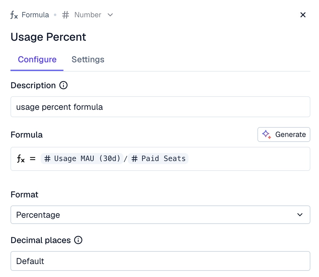 Here is an example of using division on two synced fields to calculate seat utilization percentage.