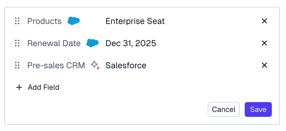 A powerful section where you can extract details relevant to your business across all the interactions of an account, including communication from all sources (email, chat, Slack, etc), Call Recording, and external or custom data sources like your CRM, Custom Activities, or API. Generated context will come with citations to where the AI context came from. You have full control to customize prompts to extract the information useful to your business!