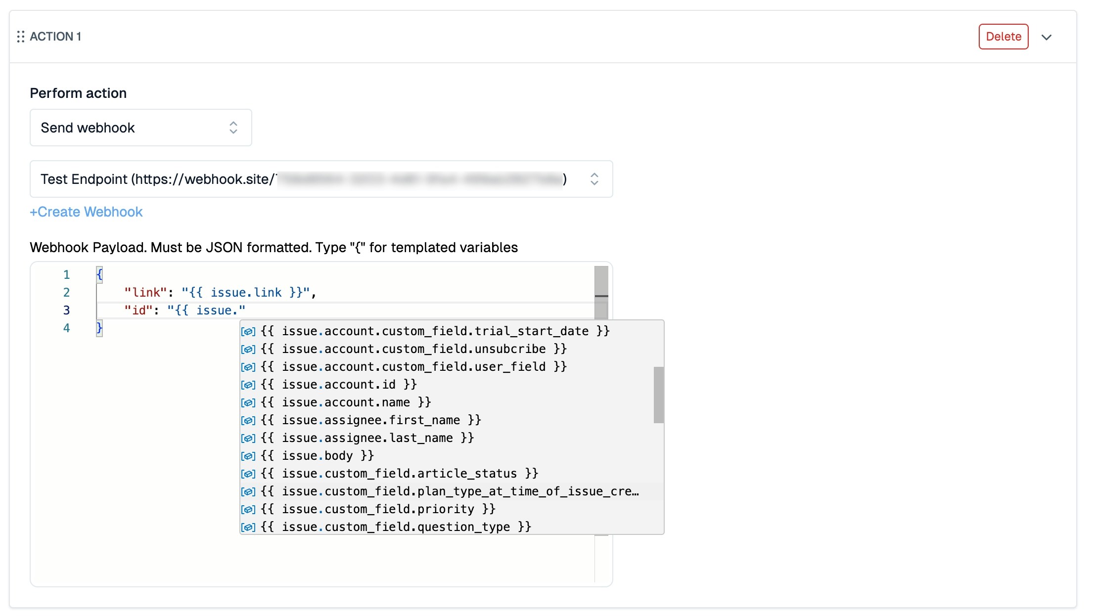- Go to Triggers in Settings and create a Trigger with an Action of “Send webhook”. Use the “When” and “If” condition of the trigger to control when the webhook fires.