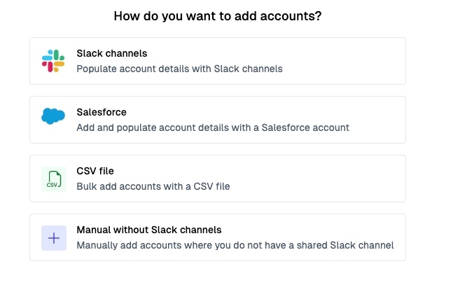 Select “Accounts” in the sidebar, and then click the purple “Add Account” button in the top right of the screen (which should bring you to the menu below). Pick “Slack” to bulk enable Pylon in relevant customer channels.