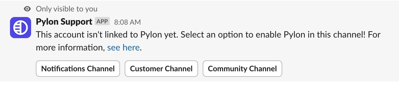 A community channel is a channel with users from many different companies, typically in a community workspace. Link this channel the same way you would a customer channel, but chooseCommunity Channel once inviting Pylon to the channel.