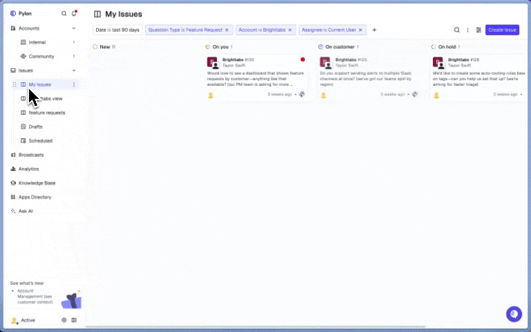 Views in Pylon help you organize and manage customer conversations across Slack, email, in-app chat, and more. With Views, you can:- Focus on what matters most by filtering Issues and Tickets by status, priority, assignee, or source