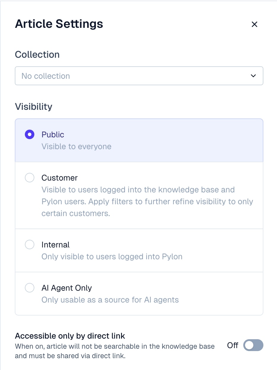 - Choose between Public, Customer, Internal, or Unlisted visibility for each article to match the desired audience.