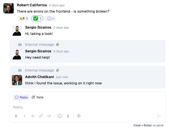 With Internal Threads, Pylon gives your team an internal place to collaborate on customer issues and take quick actions directly in Slack. This allows users without Pylon access to collaborate on issues without leaving Slack while still syncing the conversation across Slack and Pylon.
