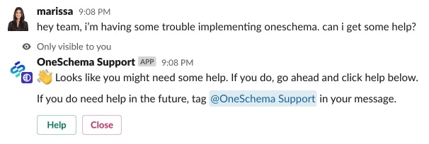 If enabled, when a customer sends a message that looks like a support question, we’ll prompt them to self-serve into creating a support ticket automatically. The message they see can be customized on the Settings Page. This message is only visible to the question asker and balances ongoing education with minimal intrusion.