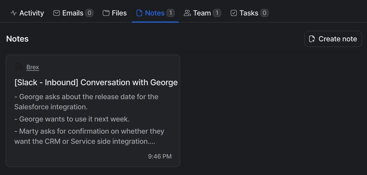 Every day, Pylon scans your customer channels for conversations that were had. For every conversation, we use AI to summarize the details, and sync the summary to the relevantCompany in Attio.