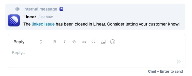 Comments in Linear sync as internal notes to Pylon. In addition, when a Linear issue is completed, the Pylon issue receives a notification and gets moved to “On You”, letting you know to tell the customer about completed change.