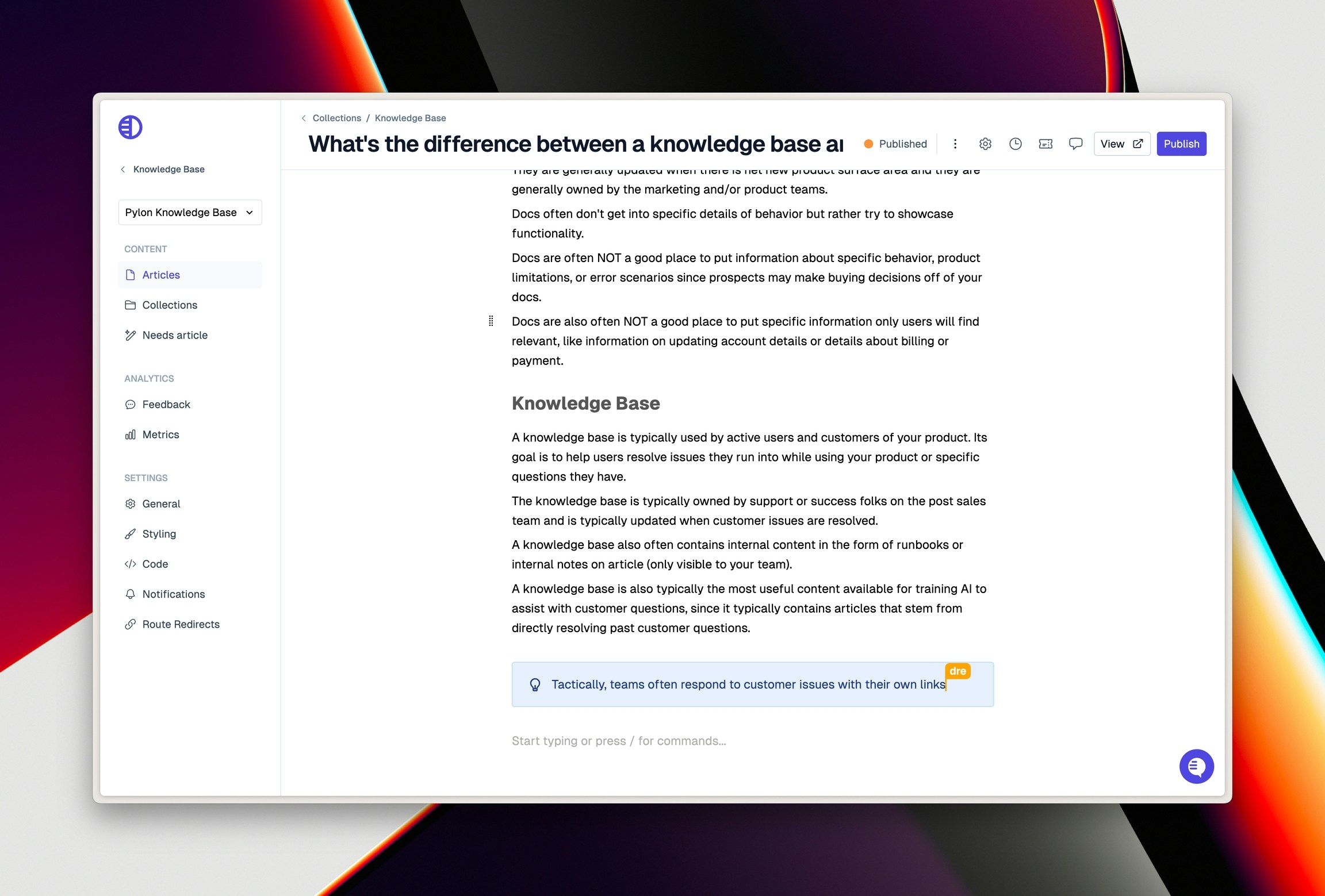 Leave Google-docs style comments on articles to leave or request feedback on content. In comments you can:- Use rich text like bolds, italics, links, code, etc.