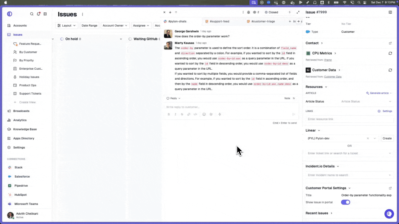 To make it easy to go from an issue resolution to a knowledge base article, Pylon allows you to generate an article directly from an issue. Pylon’s AI will read through the conversation and draft a knowledge base article documenting the solution. You can then make modifications to this article and immediately publish it!If you have created article templates, you can specify a template for the AI to follow when it’s generating!