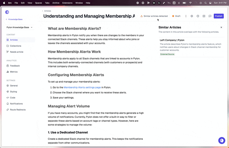 When creating a new article in the knowledge base, Pylon will detect if there are any similar articles already present and warn you. This helps prevent the creation of duplicate content.Pylon can detect similar content even if the duplicate knowledge is outside of Pylon 🤯