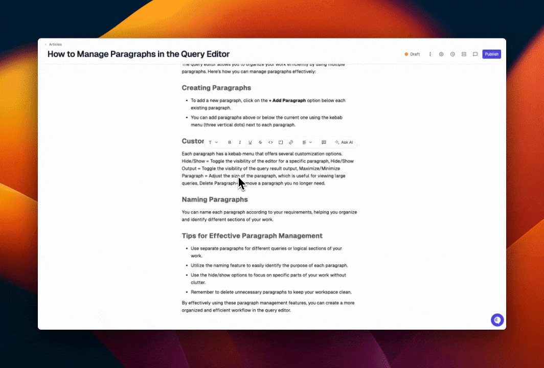 Highlight any text and press “Ask AI” to get help iterating on articles. This could include rewording sections, changing paragraph structure, revising tone, or anything else you can think of!