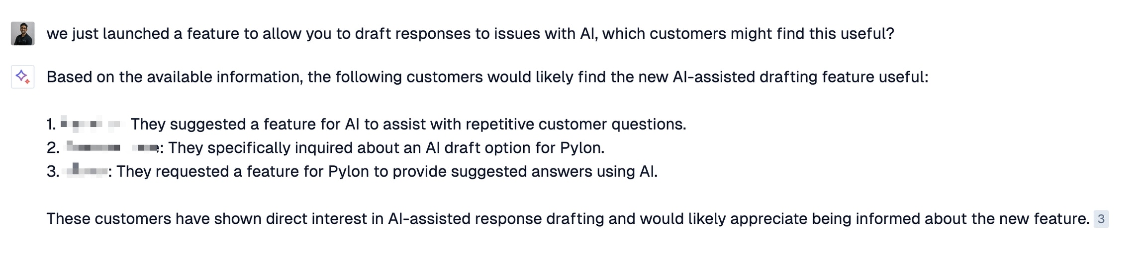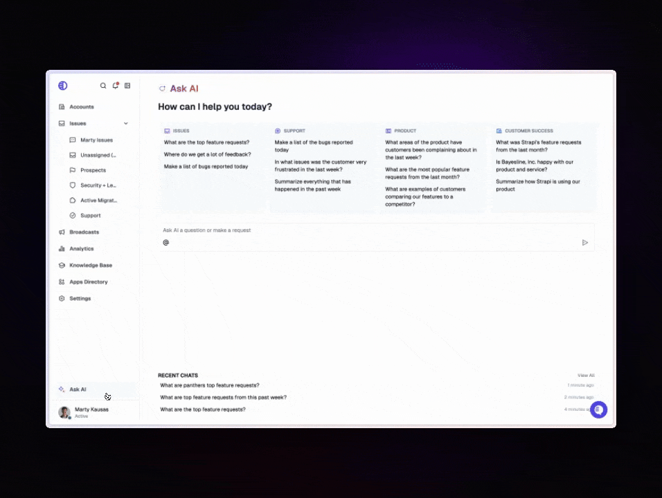 Use Ask AI to gather product feedback or inform customer evidence on product specs:- We launched x feature in beta last week, what has been all the feedback we’ve gotten about it?