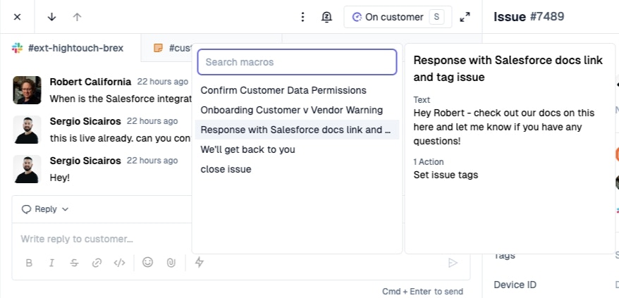 Visit the Settings Page and look for Macros to set up new macros.- Set up a templated response using dynamic variables. When a macro is used, this text will be pre-filled in the editor, and all you’ll have to do is hit send!
