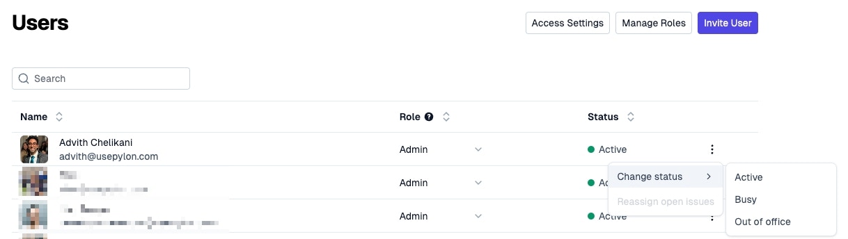 Users can be one of three statuses: active, busy, or out of office.Setting Status