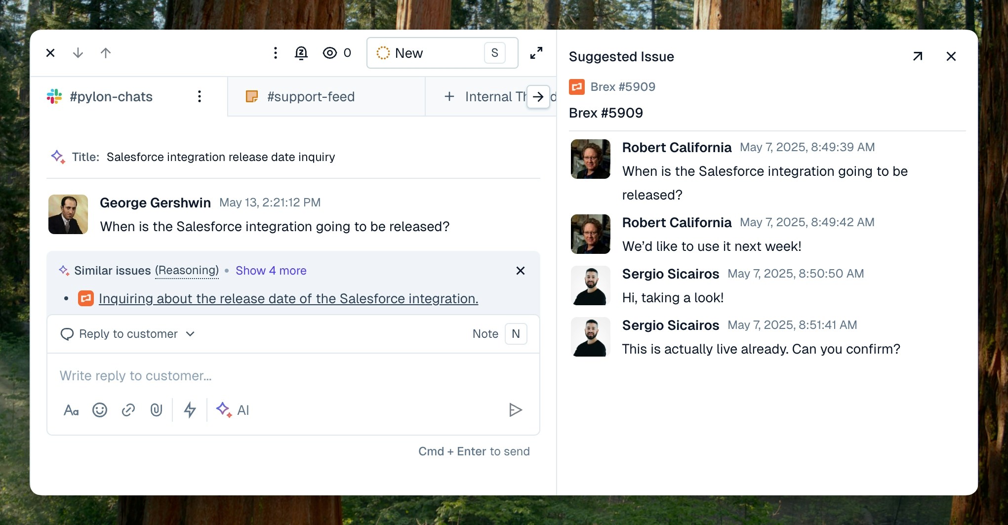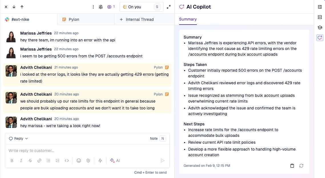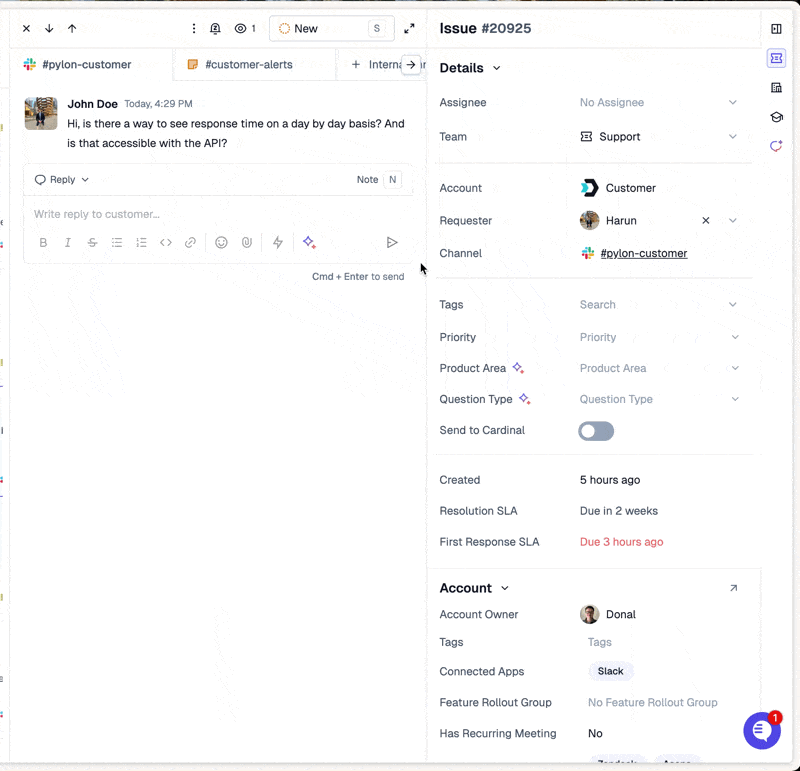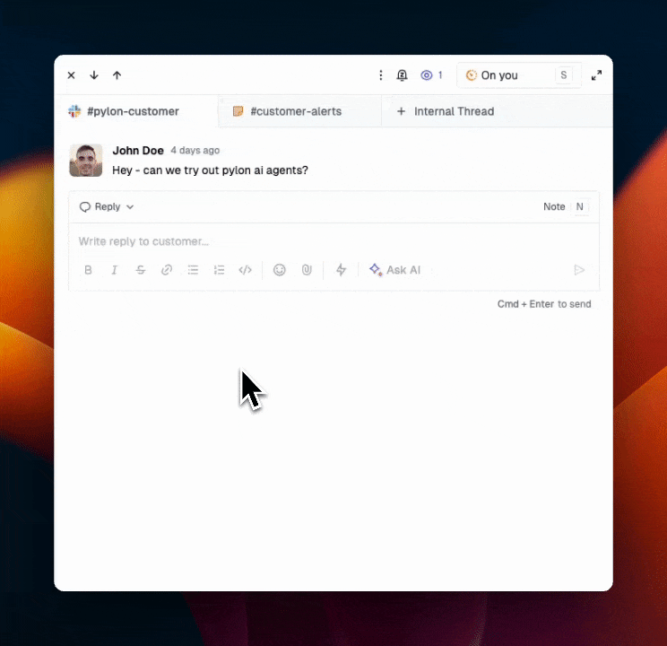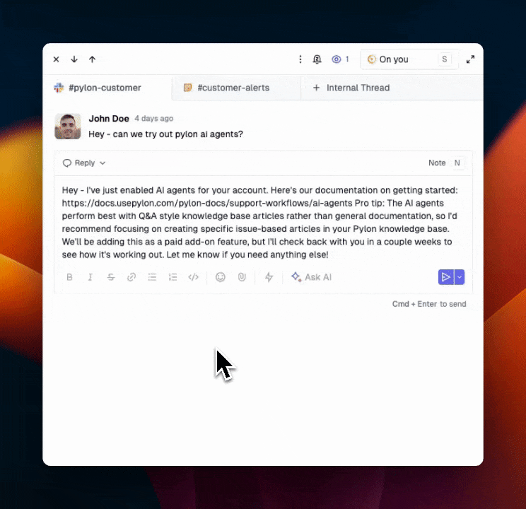 Allow Pylon AI to draft a response to your customer issue for you. Use the context of all your past issues, your Pylon knowledge base, and any other connected documentation sources.