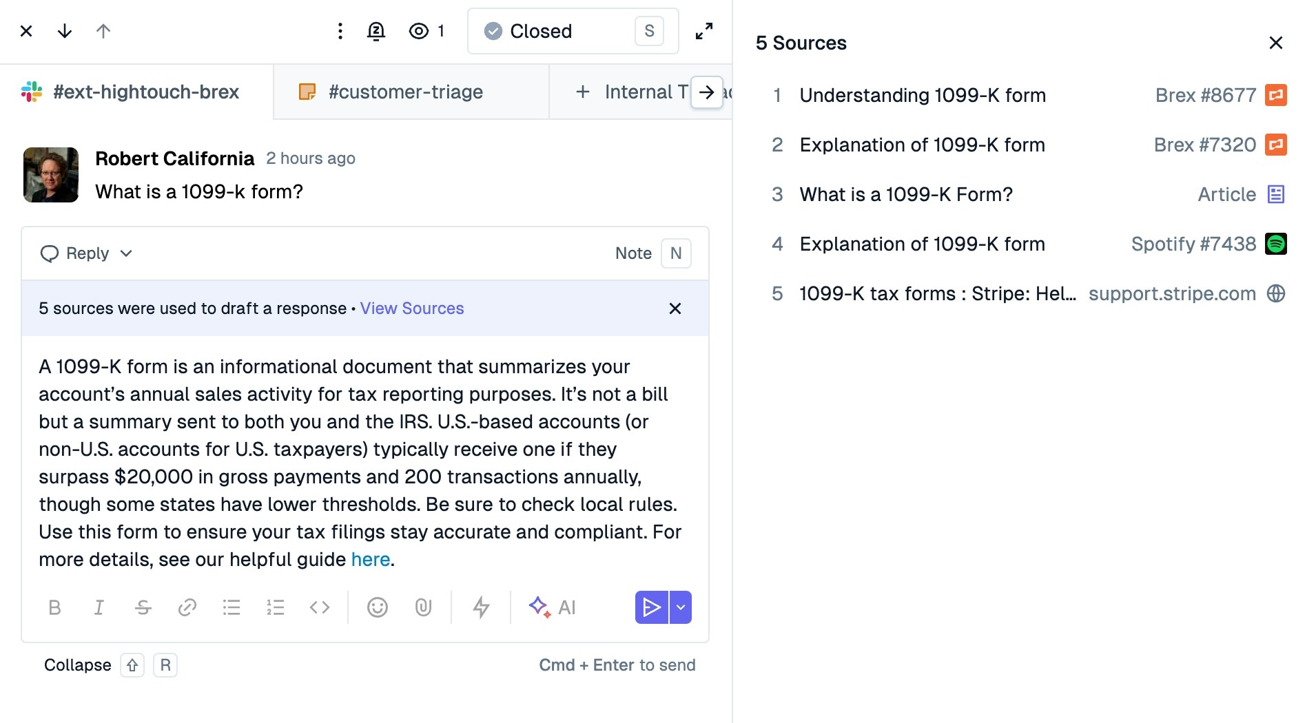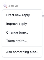 Ask AI allows you to ask open-ended questions to help you troubleshoot issues. All answers will also pull up citations to related content to help you draft your response to the customer.