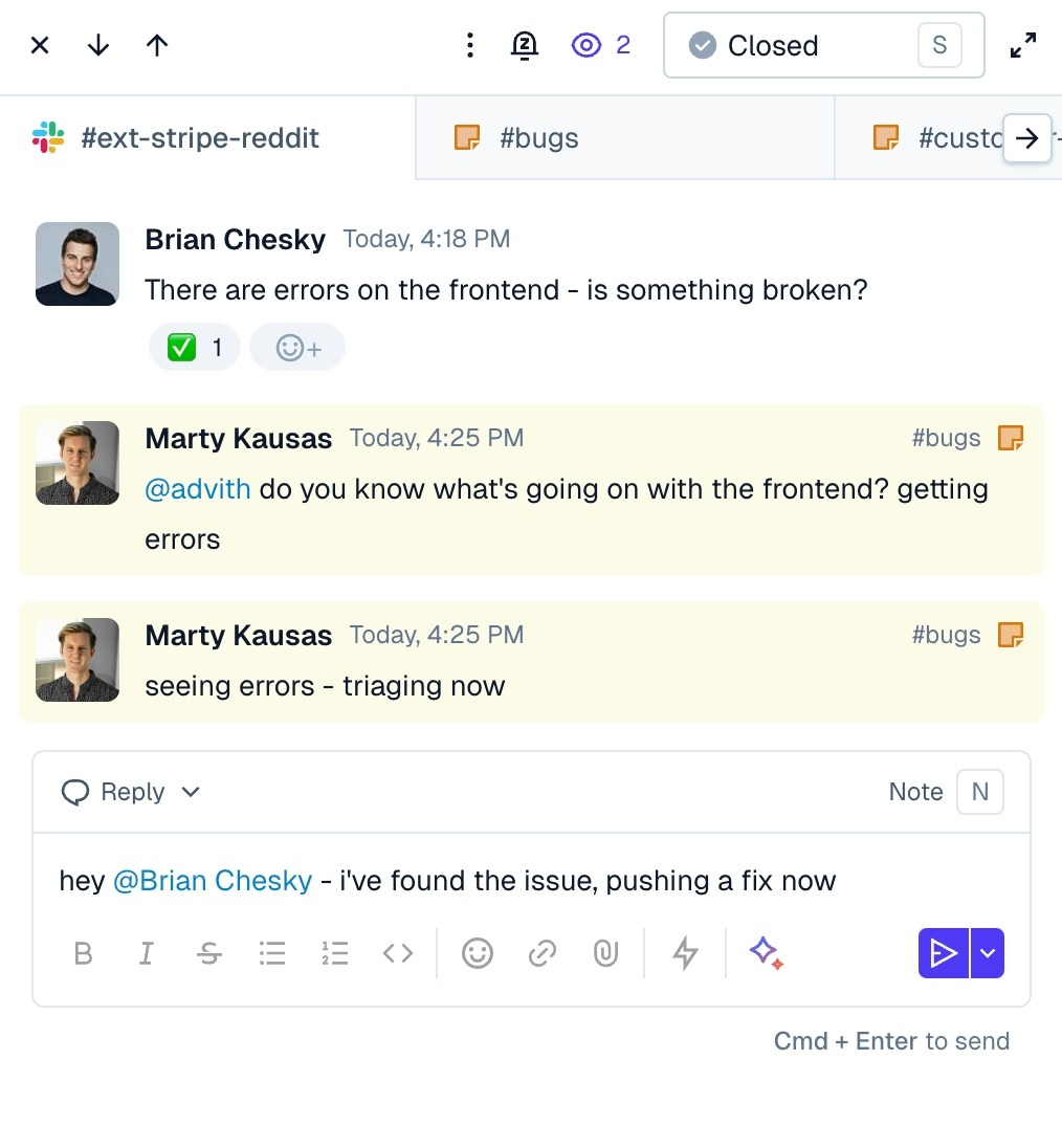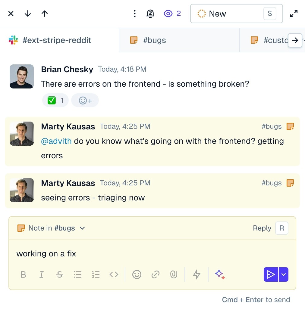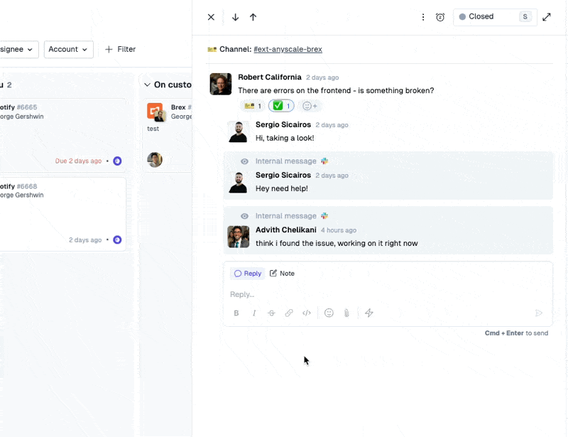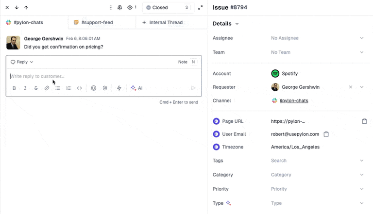 SelectingNote indicates that the message will not be visible to the customer. Depending on your configured settings and integrations, the message will either only be visible in Pylon, or be visible in Pylon and posted to the issue thread in your Internal Threads.