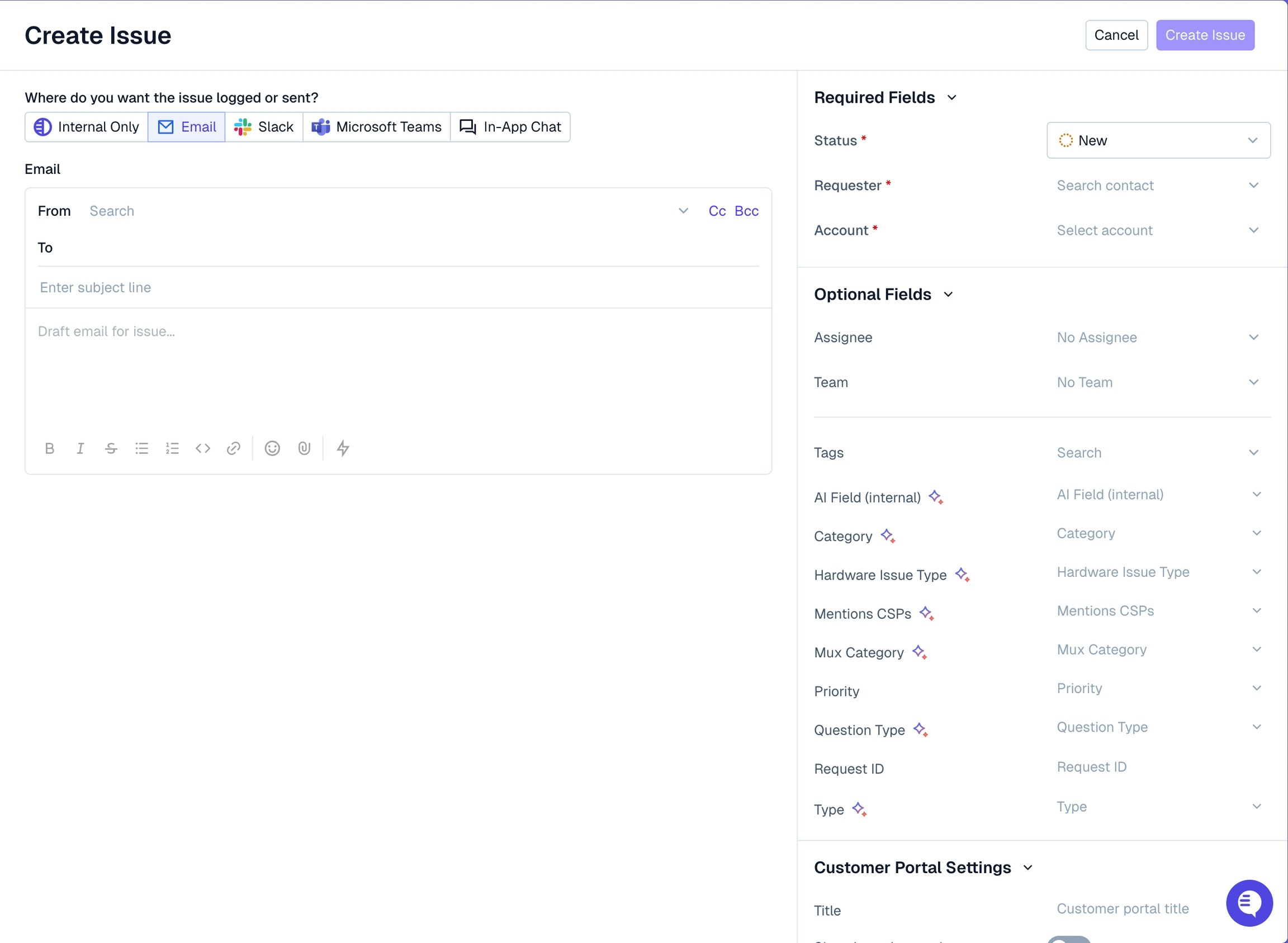 Create an issue that is only visible internally to your team. Manually set the account of the issue as the customer account to attribute work to the proper customer. This is best used when:- Tracking work from a customer call